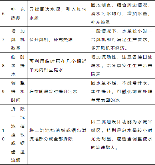 1、環(huán)境溫度降低至零度以下,厭氧、好氧系統(tǒng)的溫度可能會(huì)相應(yīng)降低,但對(duì)系統(tǒng)的處理能力影響有限。若確實(shí)有影響,對(duì)于厭氧系統(tǒng),可以通過(guò)提高進(jìn)水水溫的方法來(lái)解決(但是,厭氧反應(yīng)器的最高溫度不宜超過(guò)38.5℃),對(duì)于好氧系統(tǒng),可以通過(guò)稍稍提高污泥濃度,或者提高溶解氧的方式解決。
