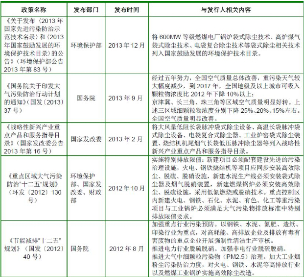 我國(guó)政府將環(huán)境保護(hù)確立為我國(guó)的一項(xiàng)基本國(guó)策,近年來,國(guó)家進(jìn)一步加大環(huán)境保護(hù)力度,推進(jìn)環(huán)境保護(hù)進(jìn)程,制訂了一系列政策  、規(guī)劃,近年來國(guó)家頒布的主要產(chǎn)業(yè)政策如下:《重點(diǎn)區(qū)域大氣污染防治“十二五”規(guī)劃》(環(huán)發(fā)〔2012130 號(hào))是我國(guó)第一部綜合性大氣污染防治規(guī)劃,標(biāo)志著我國(guó)大氣污染防治工作的目標(biāo)導(dǎo)向正逐步由污染物總量控制向改善環(huán)境質(zhì)量轉(zhuǎn)變,由主要防治一次污染向既防治一次污染又注重二次污染轉(zhuǎn)變。通過實(shí)施該規(guī)劃,到2015 年,重點(diǎn)區(qū)域(涉及京津冀、長(zhǎng)三角、珠三角等19 個(gè)省、自治區(qū)、直轄市)二氧化硫、氮氧化物、工業(yè)煙粉塵排放總量分別下降12%、13%、10%,可吸入顆粒物(PM10)、二氧化硫、二氧化氮、細(xì)顆粒物(PM2.5)年均濃度分別下降10%、10%、7%、5%。