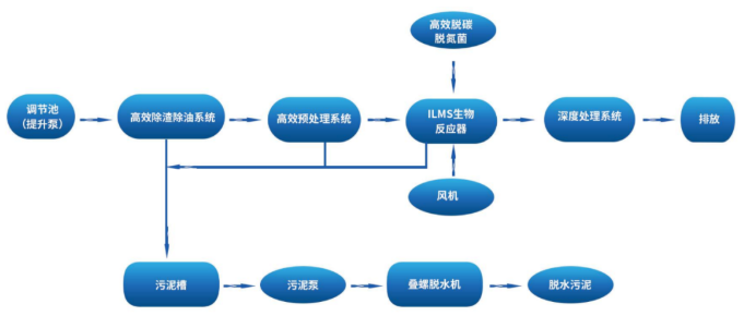 ILMS工藝是以ILMS高效生物反應(yīng)器為核心處理單元,通過(guò)前端高效物化預(yù)處理和尾端深度凈化實(shí)現(xiàn)垃圾中轉(zhuǎn)站壓濾液的達(dá)標(biāo)排放,該工藝流程圖如下: